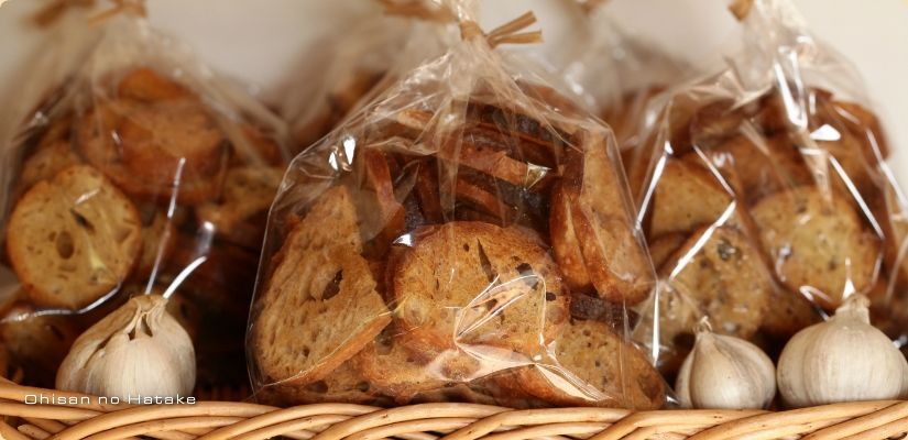 薄くスライスしたバゲットに、和蔵畑のニンニクを使ったニンニクオイルを塗り、塩と挽き立てのブラックペッパーを振ってカリカリに焼き上げました。