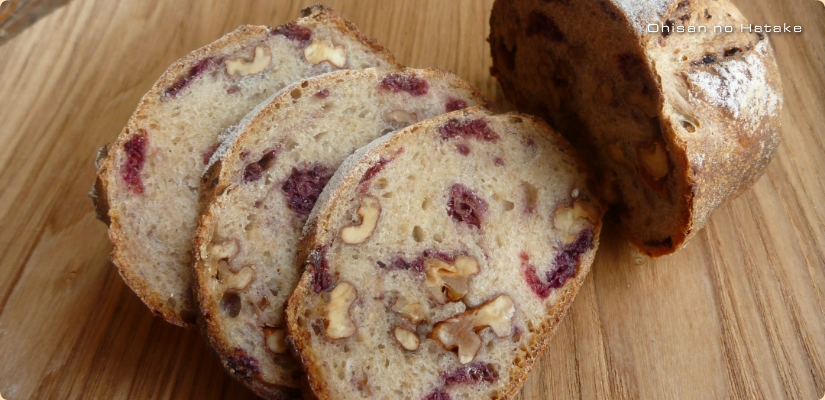 コクのある石臼挽き小麦に粗挽きライ麦粉と米ぬかを少量混ぜた生地に、長野県産の鬼クルミと庭のオオバライチゴで作った自家製ドライイチゴを練り込み、香ばしく焼いたハードパン。