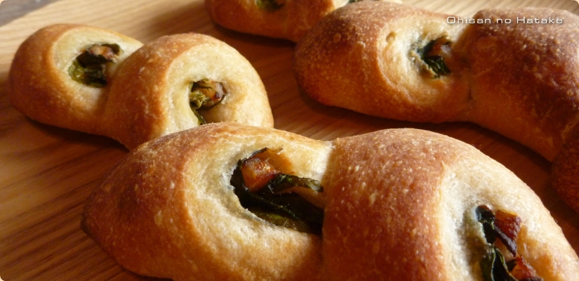 石臼挽き小麦を多く配合し、低温で長時間発酵させた生地に、季節の野菜と、ハーブの香りが加わった飛び魚の燻製を包み、オリーブオイルを塗って稲穂の形に焼いたハードパン。外はカリっと中はもちっと、噛むほどに燻製された飛び魚の甘みとハーブ、野菜の香りが広がります。