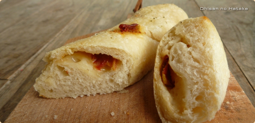 オリーブオイルをたっぷりと練り込んだ生地で、LaTo(熊本県)のドライトマトと上野原牧場カドーレ(広島県)のモッツァレラチーズを包み、きたの農園(屋久島)のハーブソルトをトッピングして焼き上げました。